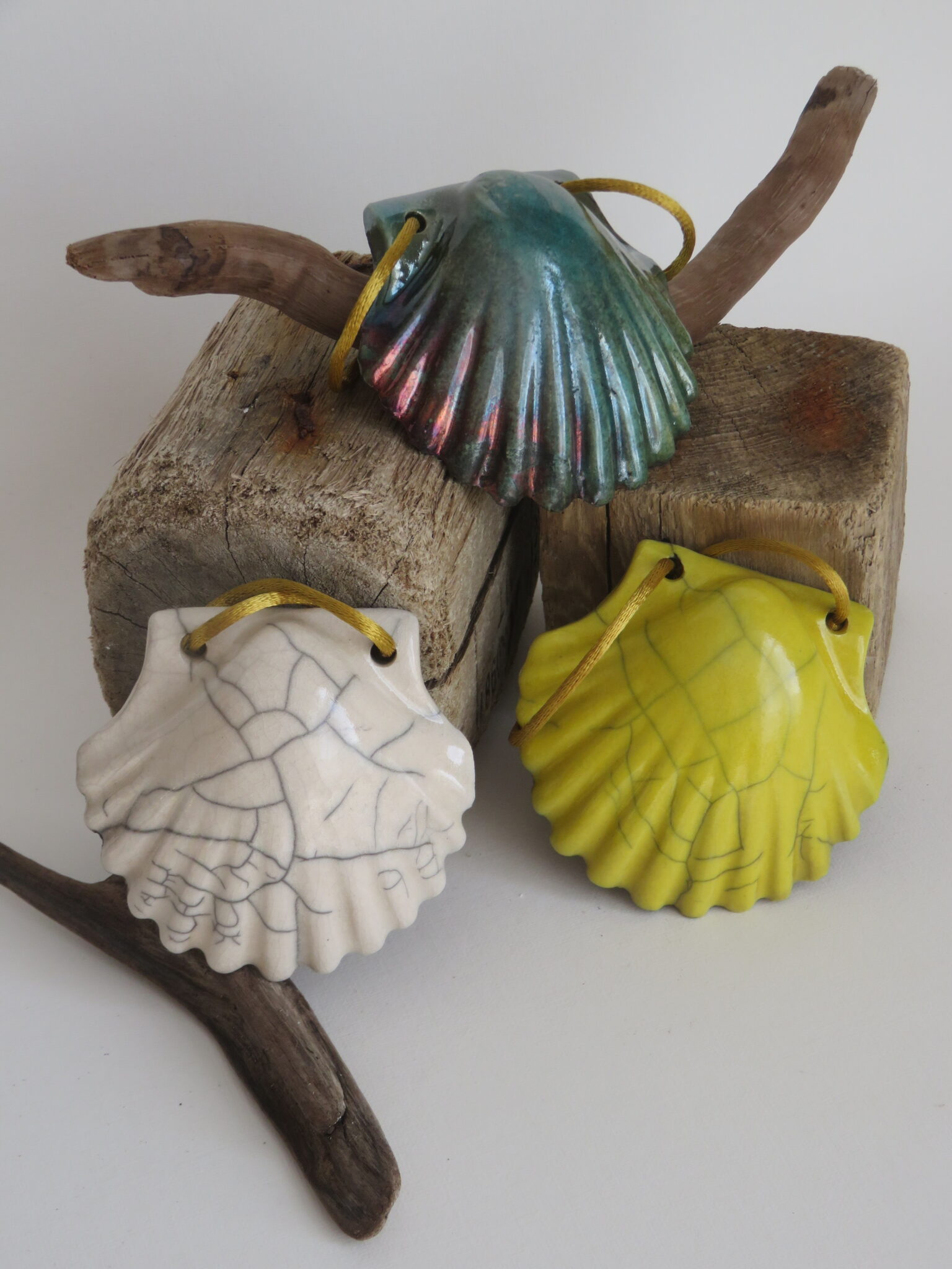 Concha decorativa de cerámica, modelada a mano y cocida con la técnica raku, donde el fuego y el humo crean reflejos, matices y craquelados irrepetibles. Cada pieza es única.