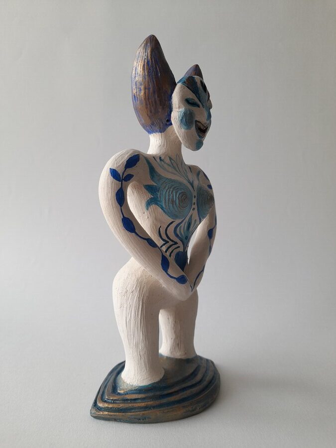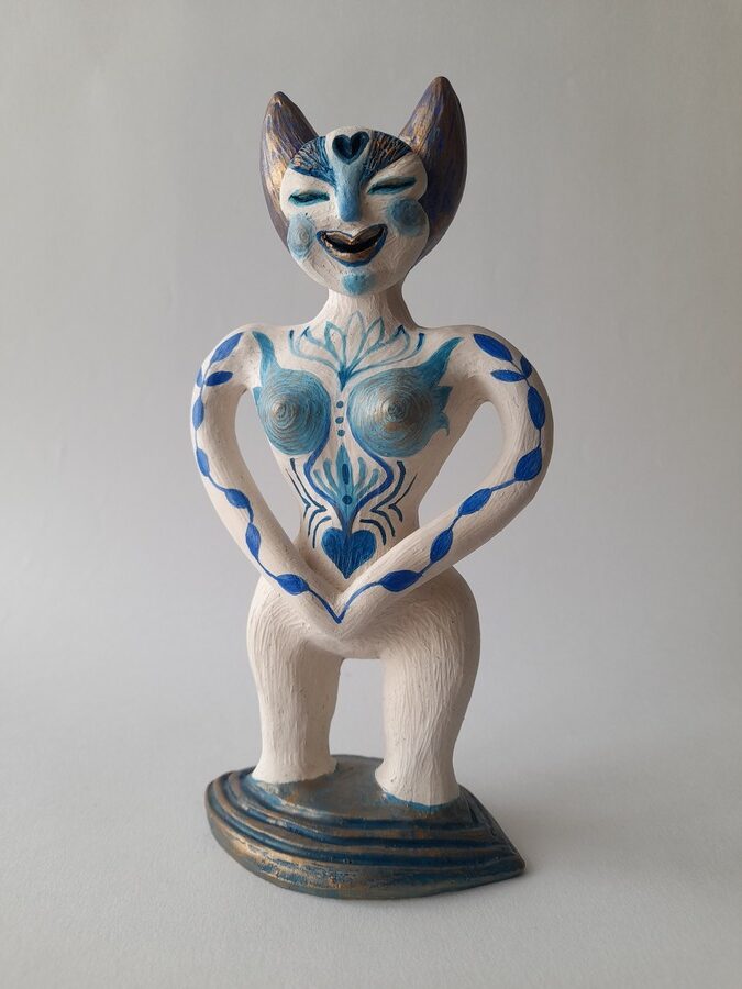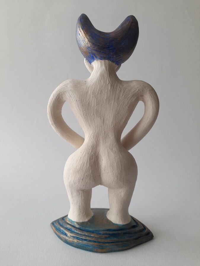 Figura decorativa modelada a mano en arcilla blanca chamotada, representando una presencia femenina serena y simbólica. Inspirada en la energía lunar, esta pieza evoca intuición, sensibilidad y conexión con los ciclos naturales.