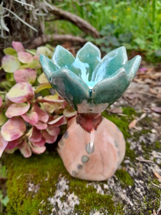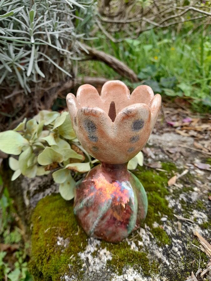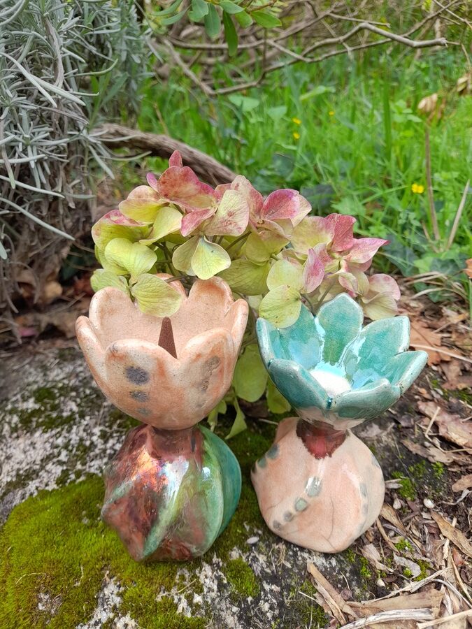 Flores de cerámica modeladas a mano en arcilla blanca chamotada, pensadas para sostener conos de incienso. Cada pieza combina forma escultórica y función, creando un pequeño ritual de calma y belleza.