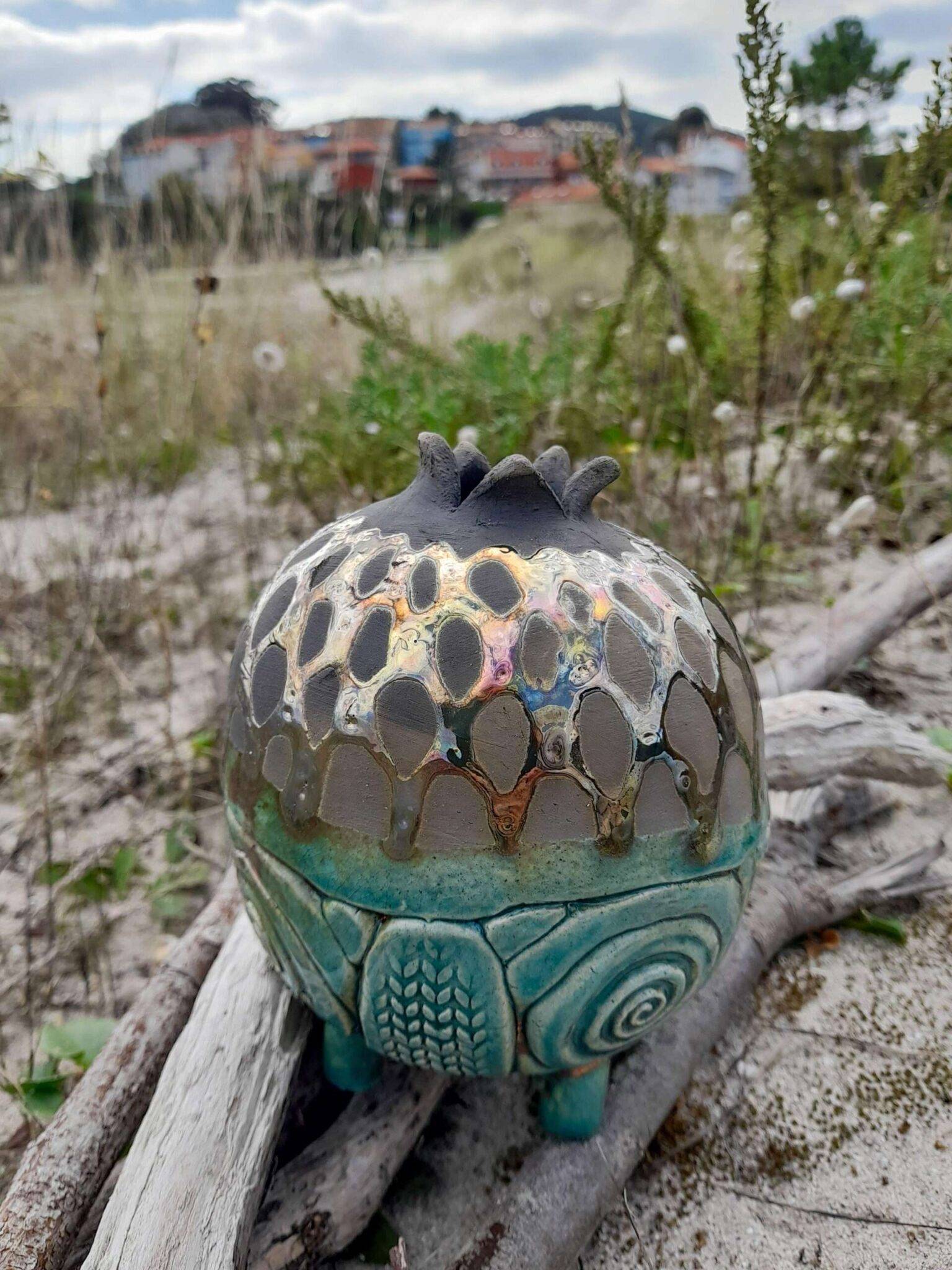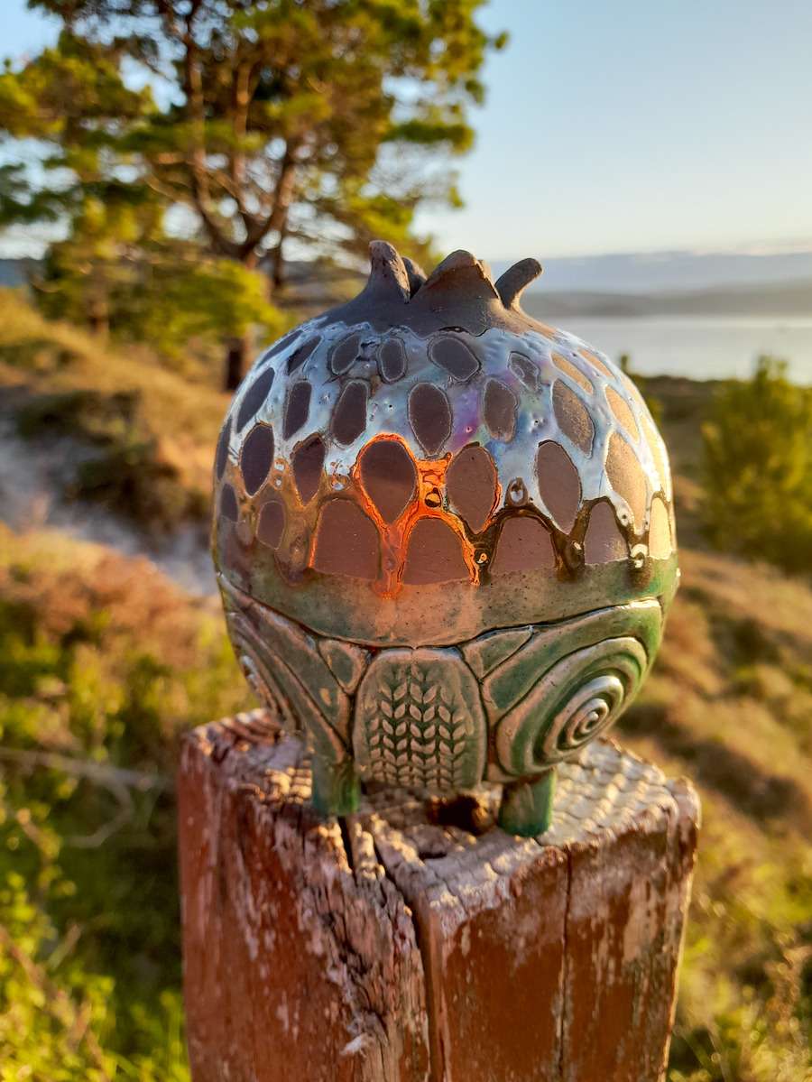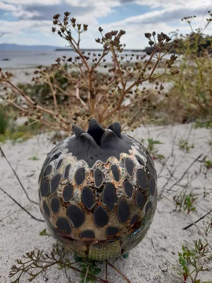 El resultado es una pieza que evoca formas de la naturaleza — frutos, semillas o estructuras antiguas — uniendo tradición y expresividad contemporánea.