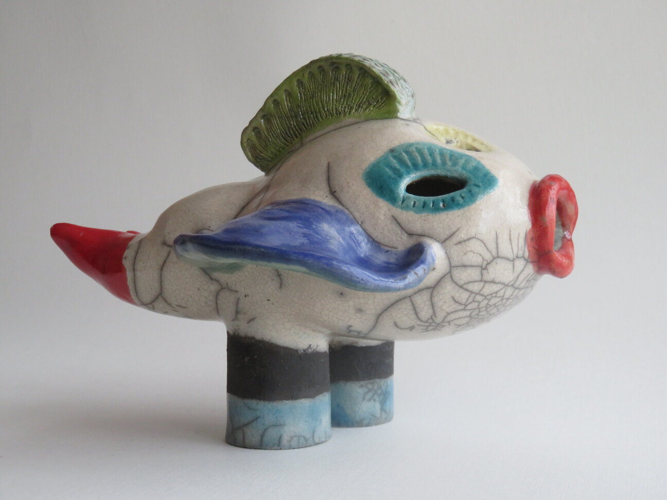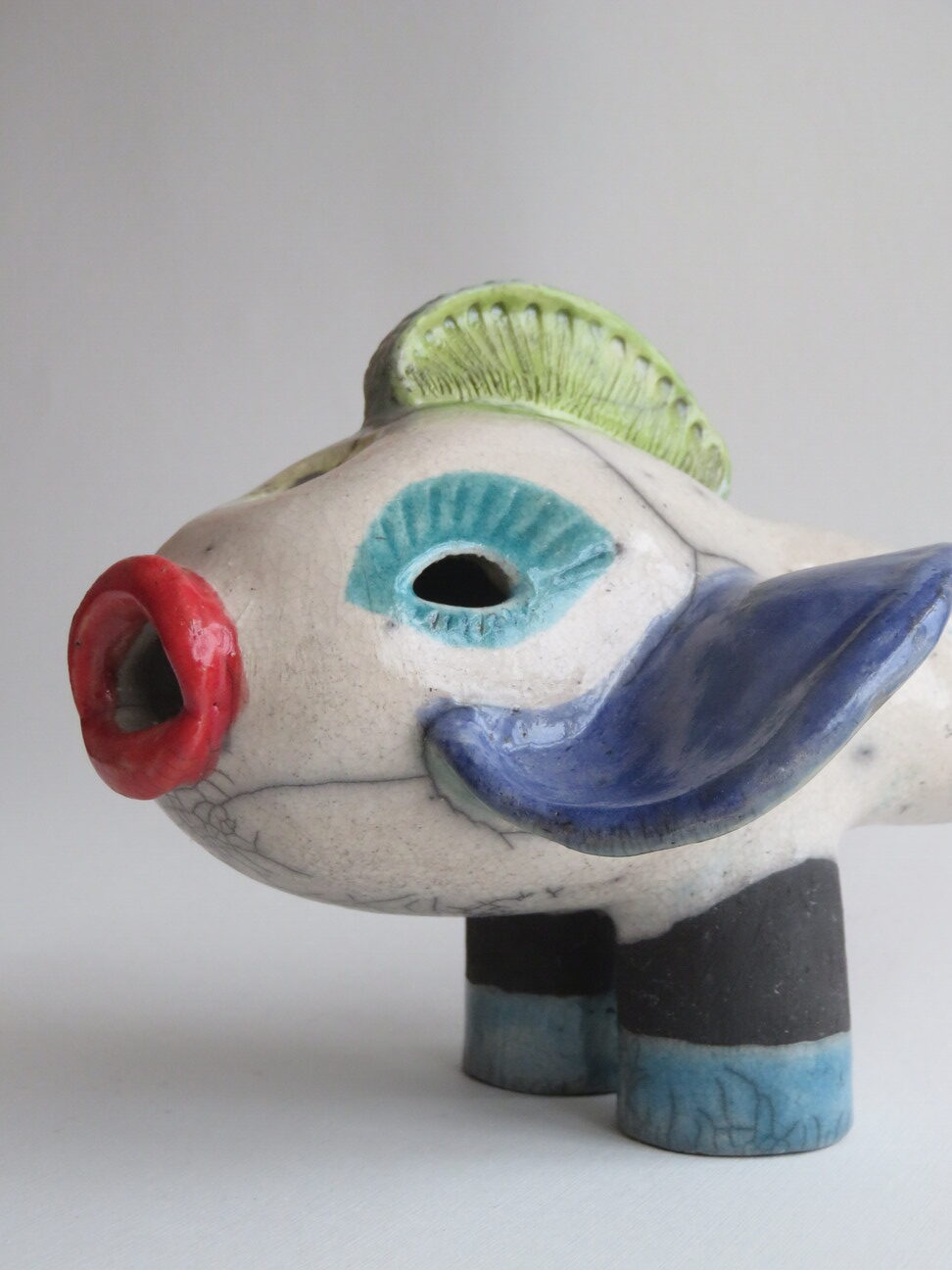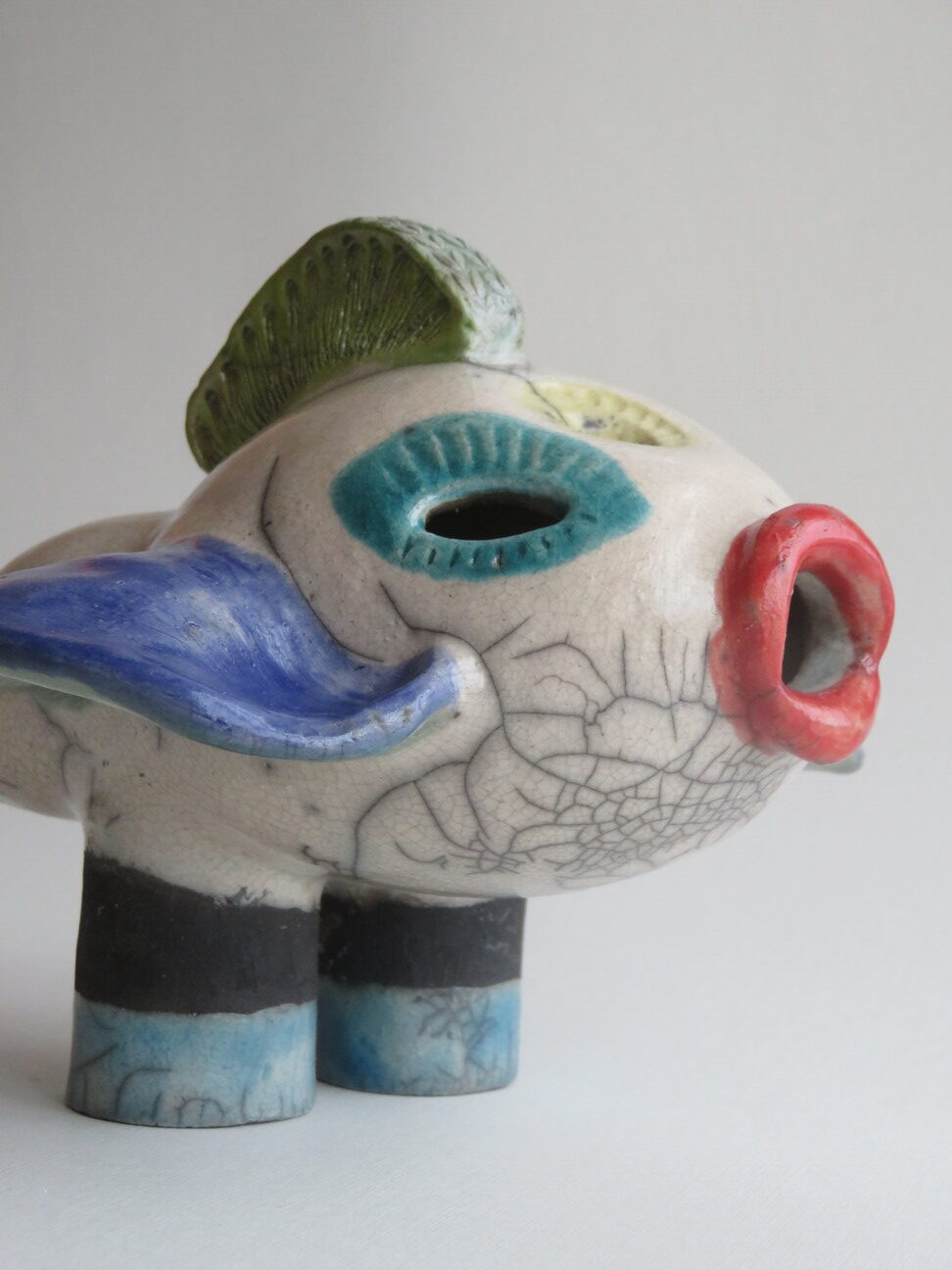 Modelado manualmente en arcilla blanca chamotada SiO-2 y esmaltado con esmalte transparente y colores vivos. El acabado raku aporta craquelados imposibles de repetir.
