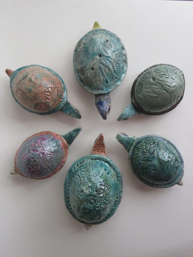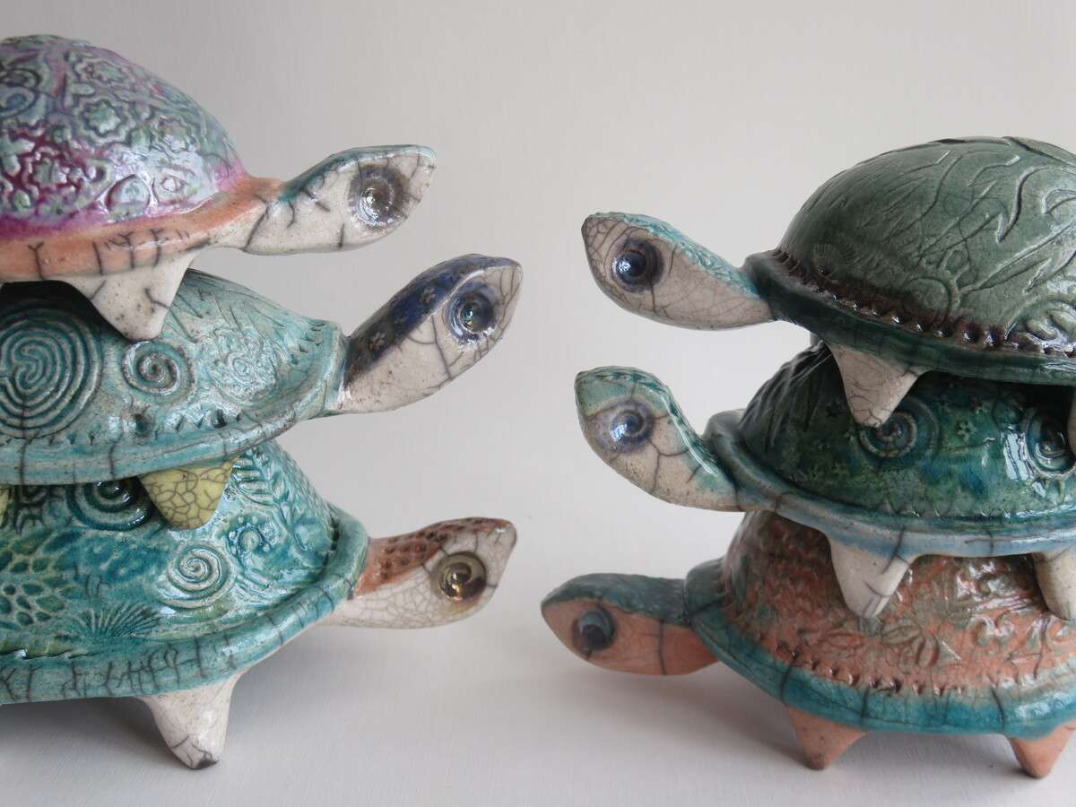 Tortugas decorativas de cerámica raku, piezas exclusivas y únicas, modeladas a mano con arcilla blanca chamotada SiO₂.